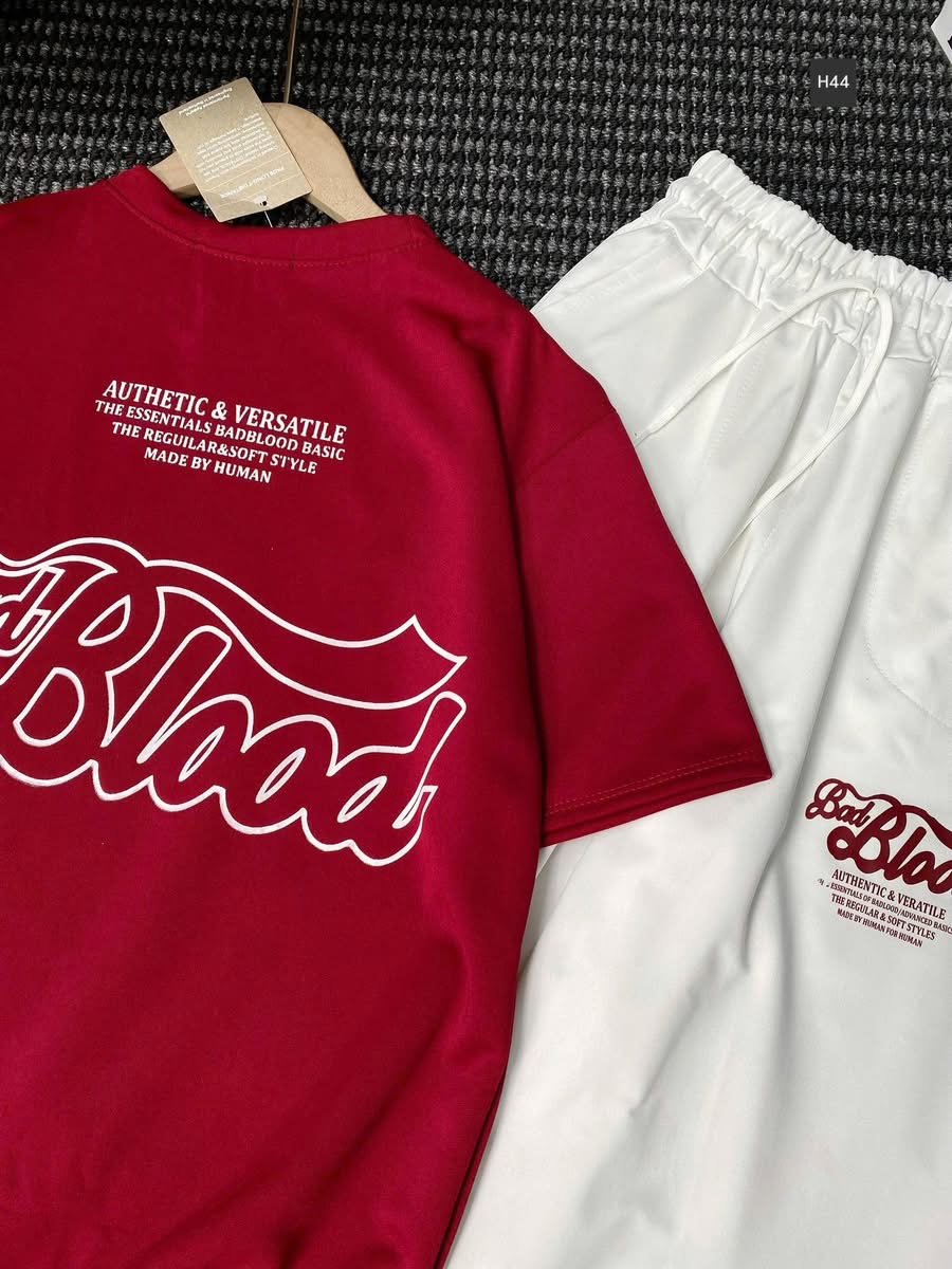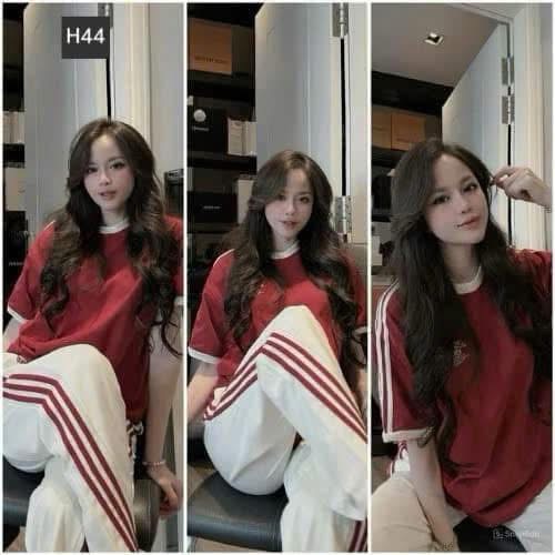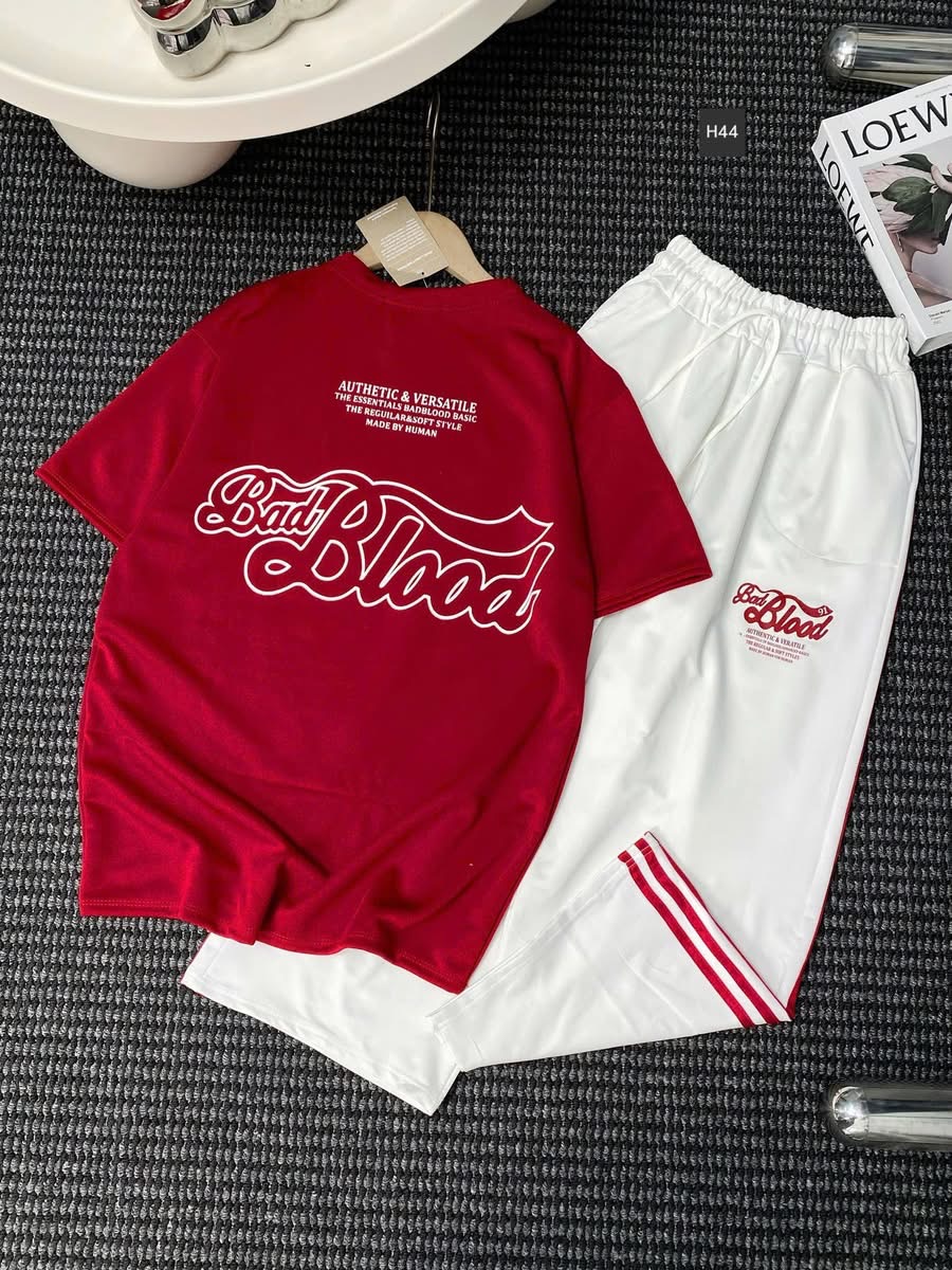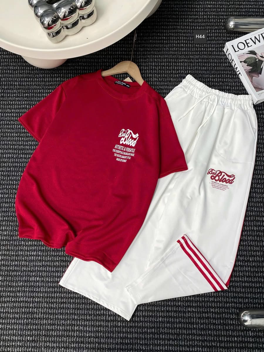 ງານເຊັດ ເສື້ອ+ໂສ້ງ ເສື້ອສີແດງສະກີນໜ້າ-ຫຼັງ,ໂສ້ງສີຂາວແຂບສີແດງ